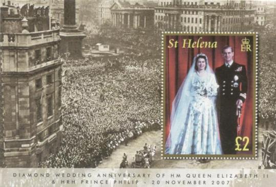 Марка издана в блоке. На поле блока — народные торжества в честь бракосочетания принцессы Елизаветы 20 ноября 1947 на Трафальгарской площади в Лондоне. Слева видна колонна Нельсона.