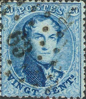 Бельгия, 1863/1865, 20 c. П. высокая. 12 (1/2). синяя