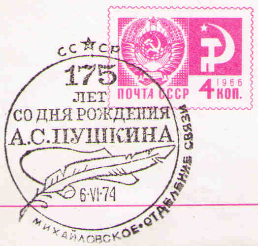 Михайловское Псковской области. 175 лет со дня рождения Пушкина. Перо и свиток.
