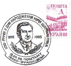Ивано-Франковск. 100 лет со дня рождения Юрия Шкрумеляка. Портрет Юрия Шкрумеляка, лавровые ветви.